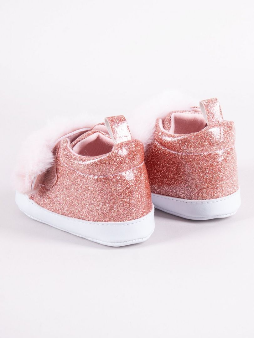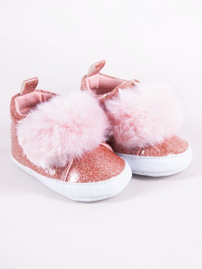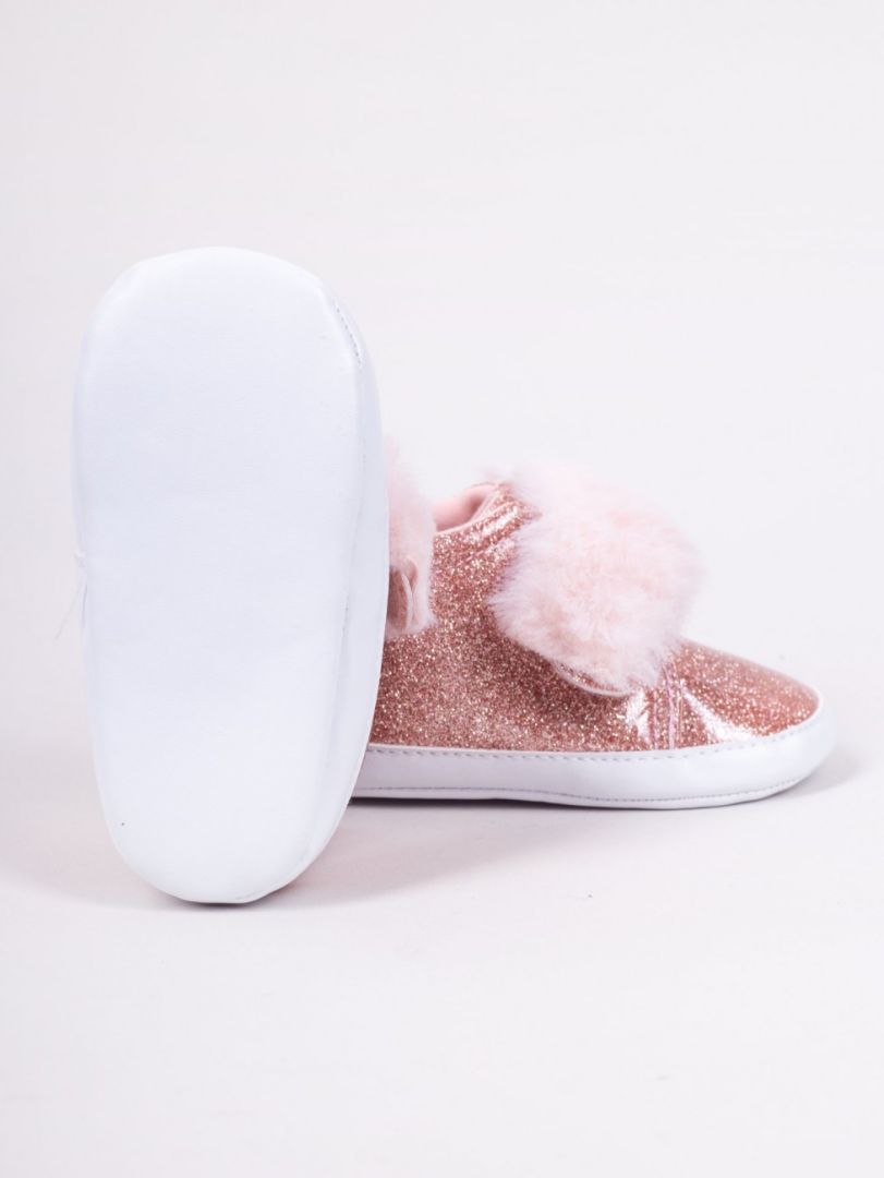 ŚLICZNE BUCIKI DZIECZĘCE OZDOBIONE RÓŻOWYM FUTERKIEM.