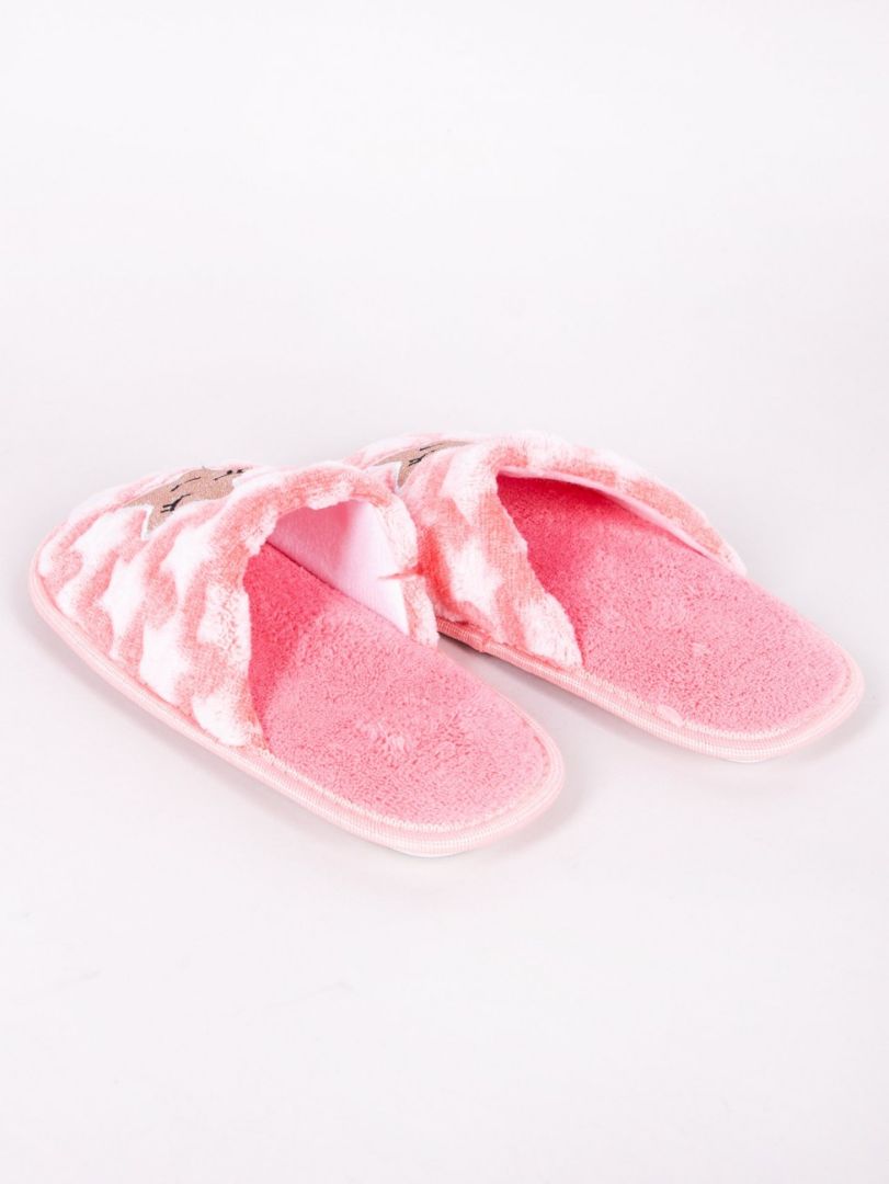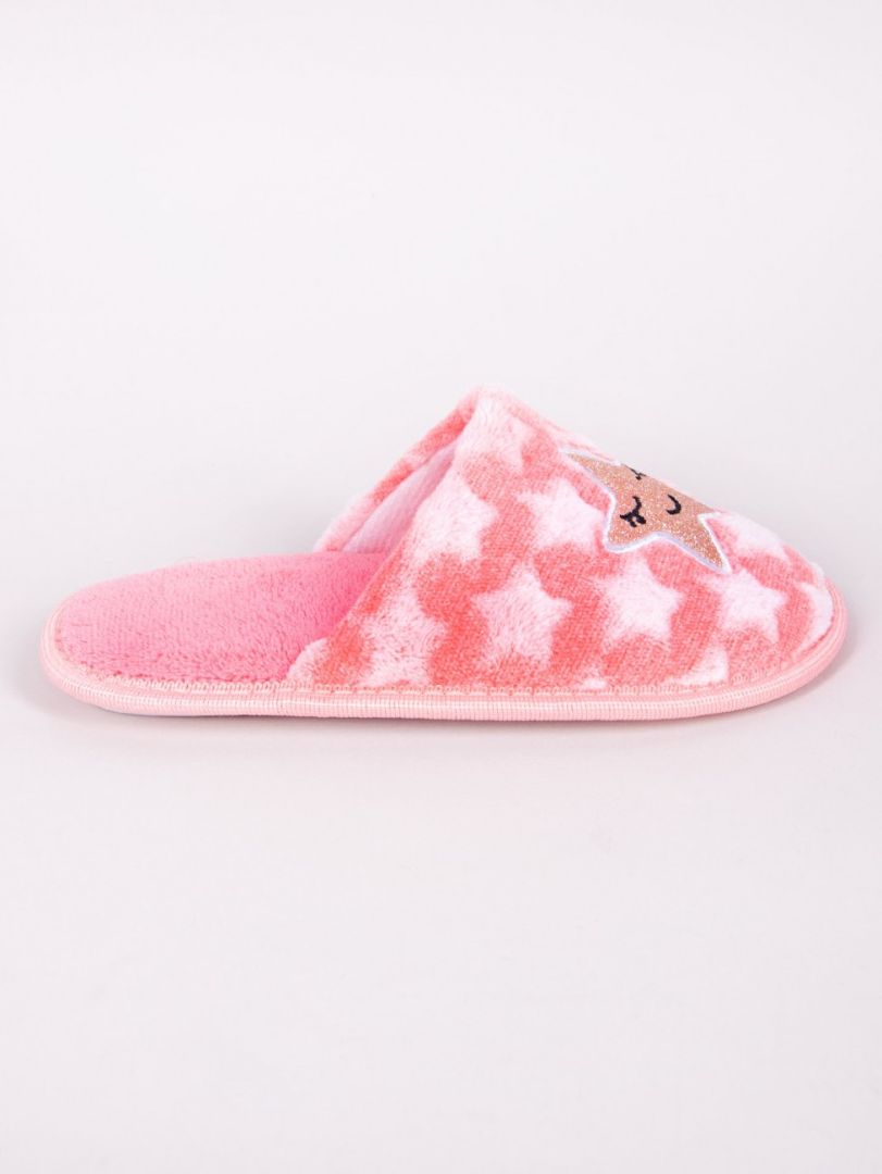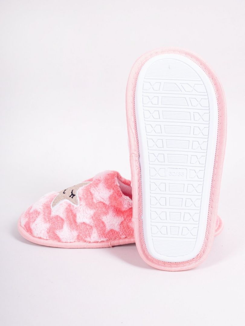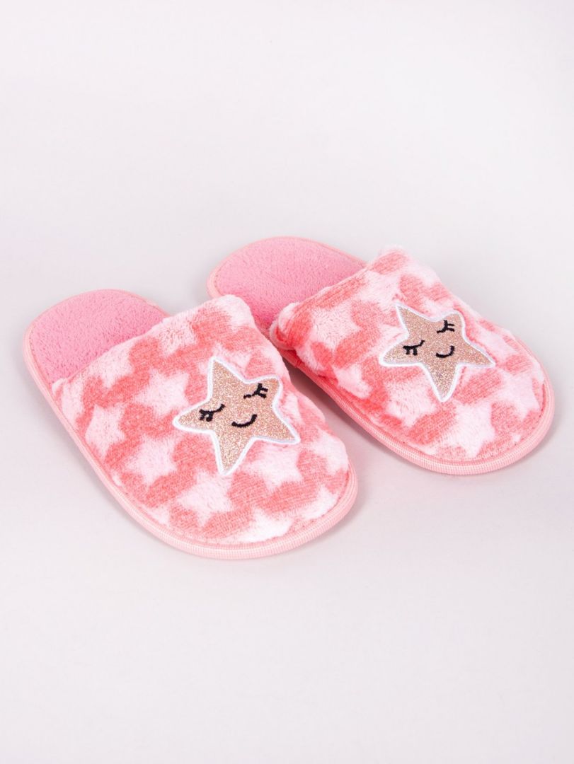 Różowe kapcie domowe. na przodzie zodobnik gwiazdka broaktowa.